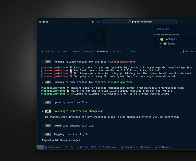 2You can skip the release part when prompted for now. Check how the workspace got updated, incrementing the package.json version property and updating the version on the package dependency definition, i.e. the @tuskdesign/buttons version got updated in the @tuskdesign/forms package.json.